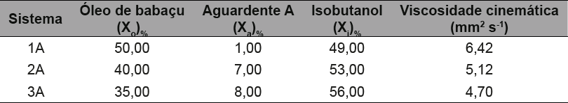 A viscosidade é uma característica comumente medida entre os combustíveis. Ela é uma propriedade fluidodinâmica importante no que diz respeito ao funcionamento de motores de injeção por compressão (motores a diesel). Para efeito de comparação, determinou-se a viscosidade do óleo diesel segundo as Normas da American Society for Testing and Materials (ASTM) D 445. A amostra apresentou uma viscosidade cinemática de 3,41 mm2 s-1. Pode ser obervado nas tabelas 4, 5 e 6 a composição das microemulsões com solução aquosa de etanol 40%, aguardente A e aguardente B respectivamente, assim como também os resultados das proporções utilizadas e seus valores de viscosidade cinemática.