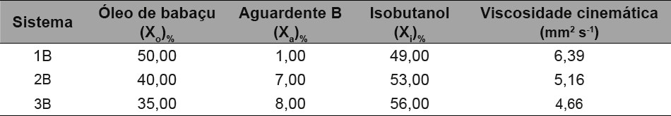 Os sistemas microemulsionados foram preparados utilizando como fase aquosa uma solução de etanol 40%, e as aguardentes comerciais A e B. A região equivalente à classificação de Winsor IV escolhida nos diagramas de fases pseudoternários corresponde às percentagens das frações em massa 35,00%, 40,00% e 50,00% para óleo de babaçu. Para a solução de etanol 40% e aguardentes 8,00%, 7,00% e 1,00% e ainda as frações 56,00%, 53,00% e 49,00% para o surfactante isobutanol. As propriedades físico-químicas avaliadas para os sistemas foram viscosidade cinemática, densidade e ponto de fulgor.
