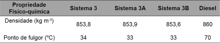 Para análise de densidade e ponto de fulgor, foram escolhidas as amostras de microemulsões que apresentaram menores valores de viscosidade, portanto, os sistemas 3, 3A, e 3B que correspondem àqueles com percentagens das frações em massa 35,00% para fase oleosa 8,00% para fase aquosa e 56,00% para o surfactante que corresponde aos sistemas. O óleo diesel também foi analisado para efeito de comparações. Na tabela 7 constam os resultados obtidos para densidade relativa e ponto de fulgor.