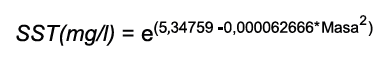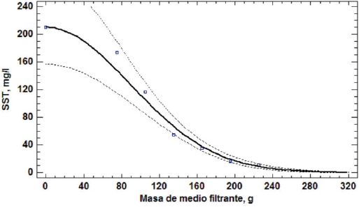 Se observa como los SST disminuyen en mayor cantidad entre los tratamientos A y C con una eficiencia acumulada de 57,1%, lo que contrasta con la disminución de la propiedad al aplicar los últimos tratamientos, para los cuales se acumula 20,5% de disminución. Lo anterior demuestra que la relación entre los SST y las cantidades de material filtrante no es lineal, por lo que se estudiaron modelos no lineales intrínsecamente lineales para definir dicha relación y se escogió el que presentara el mayor coeficiente de determinación, con lo que se obtuvo el siguiente modelo matemático: