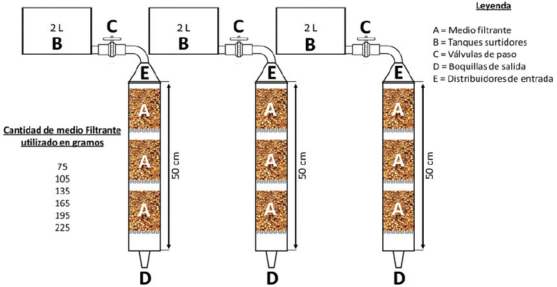 Se construyeron tres filtros con tubos de PVC de 5,1 cm de diámetro y 50 cm de longitud. En cada filtro se colocaron tres etapas de medio filtrante con masas iguales, separadas por una malla metálica y dejando un espacio vacío entre cada etapa, como se muestra en la figura 1. Al fabricarse tres filtros de iguales características, cada uno se considera una réplica.
