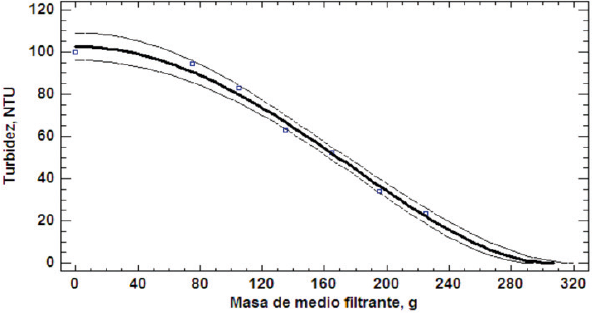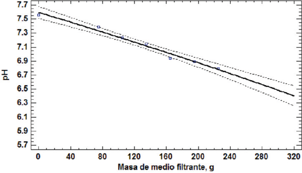 Se graficaron cada una de las variables dependientes (Turbidez, SST y pH) respecto a la variable independiente (Masa de medio filtrante), con la finalidad de establecer el modelo matemático de regresión ajustado a cada una, con el cual definir modelos de predicción aplicables al modelo de filtro construido, así como análisis de varianza de cada modelo, para obtener la significancia estadística de cada uno de los modelos obtenidos. Para los análisis estadísticos se utilizó el programa Statgrapics Centurion XVI.I y se estableció una significancia de 0,05 (95% de nivel de confianza). También se calculó la eficiencia del filtrado respecto a cada uno de las tres propiedades estudiadas, mediante la ecuación 1.