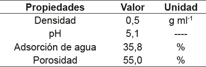 Para la preparación del material filtrante a partir de la cáscara de coco, se obtuvieron las cáscaras o endocarpios de coco de puestos de ventas en la ciudad de Lima, las cuales fueron procesadas para eliminar los restos de fibra (mesocarpio). Luego, se trituraron en molino de martillo y se tamizaron con malla de 2 mm para asegurar un tamaño uniforme de granos. Se sometió el material filtrante a lavado con agua mediante el método de extracción sólido – líquido (Soxhlet) y se secaron por 24 horas en estufa a 105 °C. Después de la preparación, el material filtrante fue caracterizado para determinar las siguientes propiedades: densidad a través del método descrito en la norma ASTM D854 [16], pH mediante el método establecido en la norma ASTM D4972 [17] utilizando un pH digital portátil Hanna HI 98130 y adsorción de agua y porosidad por gravimetría aplicando el procedimiento descrito por Bazán [18]. Los resultados se observan en la tabla 1.