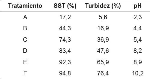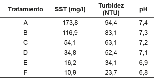 Se observa que la mayor eficiencia se obtuvo con el tratamiento F, con máxima eficiencia sobre los SST con 94,8%, en segundo lugar, se obtuvo un 76,35% de eficiencia para la turbidez. El pH aunque disminuyó en 10,2%, se mantuvo dentro del rango neutro (6,5 – 7,4), por lo que se puede decir que esta propiedad no se vio afectada de manera significativa al aplicar los diferentes tratamientos, lo que se fundamenta en su coeficiente de variación el cual fue de 3,1%, valor menos a la significancia fijada en 5%.
