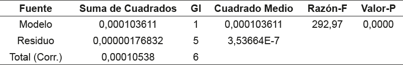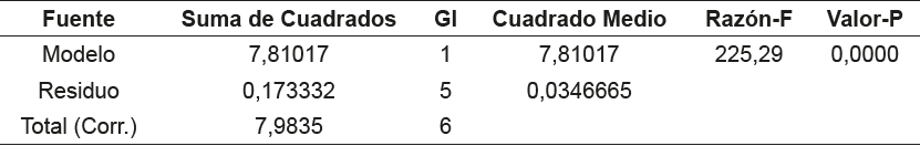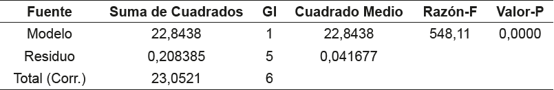 El modelo presenta un coeficiente de determinación (R2 ) de 0,98, lo que indica que el modelo predice el 98% de la variabilidad de los SST respecto a los tratamientos aplicados, así como un intervalo de confianza de ± 0,13968. Al extrapolar la curva se obtuvo (como se observa en la gráfica) un valor donde la misma se vuelve constante (aproximadamente a los 285 g). Los parámetros estadísticos asociados al modelo se muestran en la tabla 4, donde se muestran los resultados del análisis de varianza.