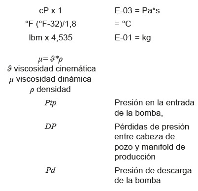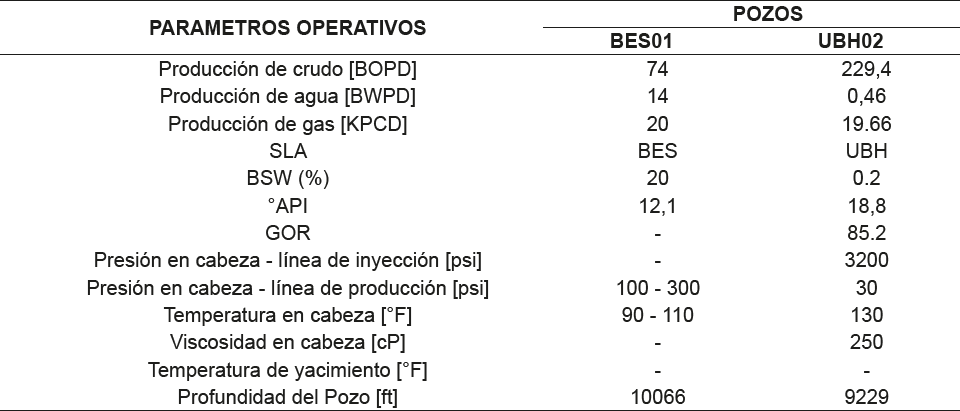 Pozos productores. Se evaluaron dos pozos productores, uno con sistema de levantamiento de bombeo electrosumergible – BES, y el otro con un sistema de levantamiento de bombeo hidráulico - UBH. Las características de estos pozos se listan en la tabla 2.