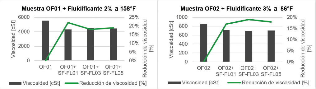 En el caso del pozo UBH02, con el fluidificante SF-FL03 se alcanzaron reducciones de viscosidad entre el 19,9% y el 25,7% a dosificaciones iguales o inferiores a 5000 ppm, demostrando mantener su eficiencia incluso con el paso del tiempo tras su adición en el sistema de levantamiento, condición importante para facilitar el transporte de fluido.