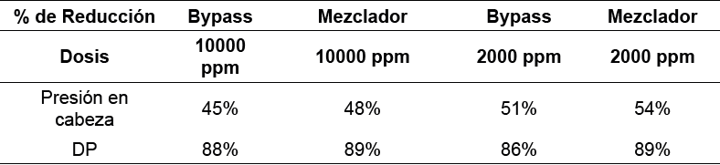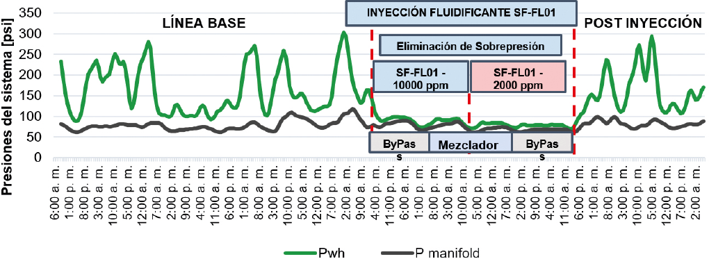 Se procede a la reducción de la dosis de inyección del Fluidificante SF – FL01. Haciendo seguimiento a las presiones en superficie se encuentra el comportamiento que se lista en la tabla 8, se presentan los resultados de la aplicación con mezclador de y los resultados de la aplicación por bypass. En la figura 3, se muestra el comportamiento de las presiones del sistema durante la aplicación del fluidificante SF-FL01, en esta se evidencia que de acuerdo a lo descrito anteriormente, el uso de mezclador estático para la aplicación del fluidificante no es necesario, debido a que el objetivo de reducir y estabilizar la presión en cabeza de pozo se logró de igual manera con la aplicación por bypass sin el mezclador estático.