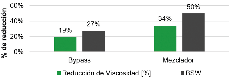 De acuerdo con la tabla anterior, la inyección por Bypass del fluidificante SF – FL01 a 10000ppm reduce el BSW: es decir, ayuda al rompimiento de las emulsiones, y la viscosidad en un 27% y 19%, respectivamente. Por otro lado, la inyección a través del mezclador estático reduce el BSW y la viscosidad en 50% y 34% respectivamente, como se puede evidenciar en la figura 4.