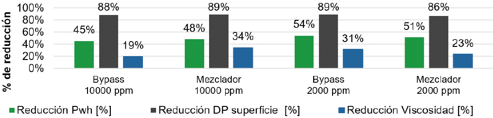 En la figura 5, se pueden evidenciar los resultados de las variables más representativas durante la aplicación del fluidificante SF – FL01 en el pozo BSE01. Se muestra, además, que a bajas concentraciones de aditivo, en 2000 ppm, se obtienen resultados favorables evidenciando la selección de una óptima dosis durante la inyección del fluidificante en campo, debido a que con esta concentración las variables evaluadas presentan el comportamiento objetivo de la aplicación, en el que se reduce la presión en cabeza (54%), se reduce la viscosidad del fluido de producción (31%) y se reducen las pérdidas de presión en el sistema de producción (89%). También es importante recalcar que los resultados de la inyección sin el uso del mezclador estático a una dosis de 2000 ppm presentan un mejor comportamiento en los parámetros de viscosidad y presiones evaluadas.
