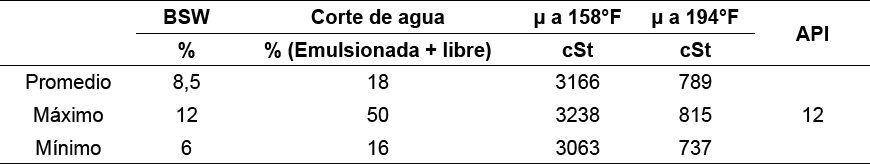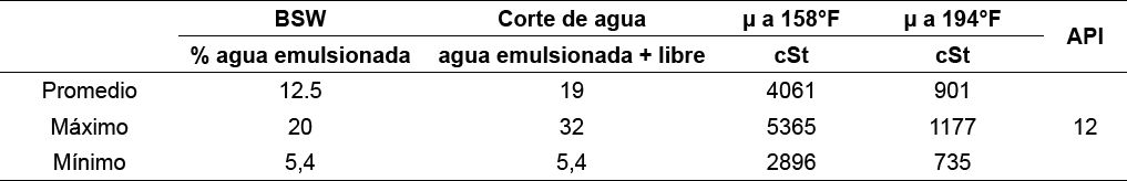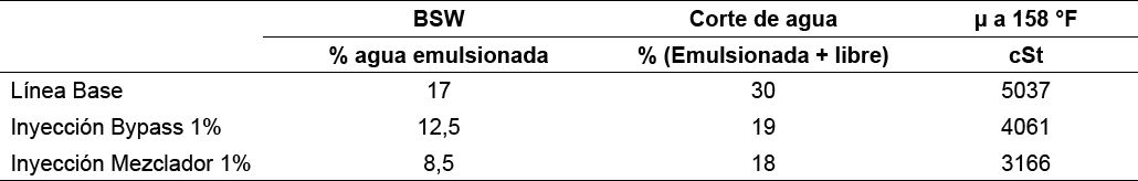 Tomando como referencia la presión en cabeza y las pérdidas de presión promedio, obtenidas del escenario de línea base, 164 psi y 85 psi respectivamente, la inyección del fluidificante al 1% con mezclador estático produjo una reducción del 48% en la presión en cabeza del pozo y del 89% en las pérdidas de presión. Así mismo, durante la inyección con mezclador estático se realizaron muestreos en cabeza de pozo, seguidamente se listan los resultados de laboratorio en la tabla 7.