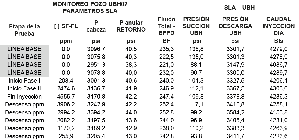 Resultados de aplicación Fluidificante SF – FL03 en pozo UBH02. Se siguió el planteamiento establecido para la aplicación del fluidificante en el pozo UBH02, se determinó la línea base sobre la cual se evalúa la inyección del fluidificante, llegando a los siguientes valores