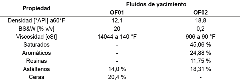Petróleo crudo. Se realizaron pruebas y ensayos de laboratorio para las muestras de crudo OF01 y OF02 que corresponden respectivamente a los pozos que fueron definidos como BES01 y UBH02. Estos crudos se encuentran dentro de la clasificación por gravedad API como crudos pesados. En la tabla 1, se presentan algunas propiedades del fluido de yacimiento medidas en el laboratorio, las cuales se han tomado como base para su caracterización.