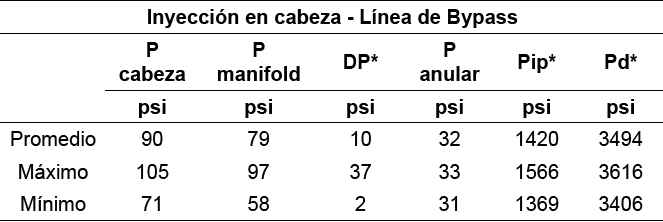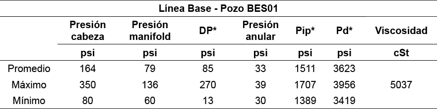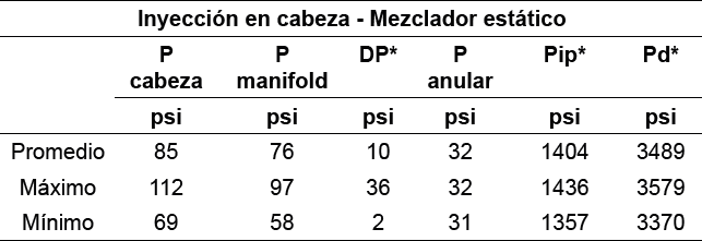 Determinación Línea Base. Durante la evaluación de la línea base se observa claramente la inestabilidad en el comportamiento de las presiones del pozo. La presión en cabeza oscila entre un máximo de 350 psi y un valor mínimo de 80 psi. Adicionalmente, las pérdidas de presión en superficie entre la cabeza del pozo y el manifold del clúster, DP, estuvieron en un valor promedio de 85 psi, registrando una caída máxima de 270 psi. Esta aplicación se realizó en cabeza de pozo debido a la no disponibilidad del capilar de inyección de la bomba electrosumergible, para lo cual, se utilizó una facilidad diseñada para la prueba, la cual contaba con una línea de Bypass y un mezclador estático, a fin de verificar si se requiere el uso o no de este tipo de mezcladores en futuras aplicaciones.