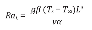 (10)Em que 𝑔 é a aceleração local devida à gravidade, 𝑇𝑠 e 𝑇∞ a temperatura da superfície do resfriador e a temperatura ambiente, respectivamente; La razão entre a área superficial e perímetro da superfície do resfriador, 𝛽 o inverso de 𝑇𝑠 ; 𝑣 a viscosidade cinemática e 𝛼 a difusividade térmica. Todas as variáveis são mensuradas nas condições de temperatura e pressão do filme, obtido pela média dos valores de 𝑇𝑠 e 𝑇∞.