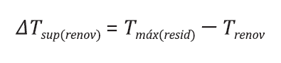 Todavia, em sistemas industriais de resfriamento de carcaças, apenas a água de renovação não consegue suprir a demanda energética das fontes quentes. Considerando que a variação de temperatura que a água de renovação consegue suprir, ∆𝑇𝑠𝑢𝑝(𝑟𝑒𝑛𝑜𝑣) é igual à diferença entre a temperatura máxima do chiller em análise (de acordo com a Portaria n° 210/1998 do MAPA) e a temperatura da água de renovação:
