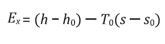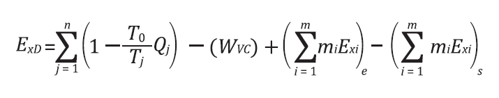 (16)Em que ℎ e 𝑠 correspondem à entalpia e à entropia da corrente nas condições de operação e ℎ0 e 𝑠0 correspondem às condições de entalpia, temperatura e entropia nas condições do estado de referência do ambiente. Ao considerar processos operando em estado estacionário, e com trabalho do eixo desprezível, a quantidade de exergia destruída (𝐸𝑥𝐷) pode ser calculada pela equação: