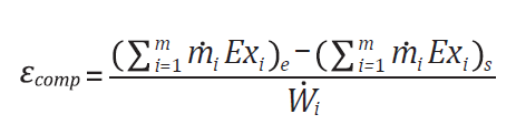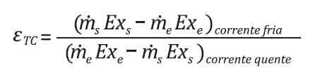 Segundo Kotas [25], outra variável importante para análise de sistemas térmicos é a eficiência exergética (𝜀), visto que promove a indicação do quanto um componente se aproxima da operação reversível. Nesse sentido, para compressores e trocadores de calor, a eficiência energética pode ser também representada, respectivamente, por [24]:
