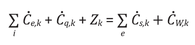 Na determinação do fluxo de custo exergoeconônimo, a equação de balanço será igual a zero uma vez que este custo já corresponde à exergia mais a destruição devido às irreversibilidades. O custo exergoeconômico de um fluxo, por sua vez, é formado por uma primeira parcela que corresponde ao custo monetário da exergia de entrada necessária para produzir tal fluxo aliado aos custos originários do próprio processo produtivo (capital, operação e manutenção) dado pelo fator exergoeconômico 𝑍, e por uma segunda parcela correspondente ao custo exergoeconômico dos produtos, no qual o custo total das correntes de exergia de saída é igual ao gasto total para obter estas correntes. Assim, o balanço de custos para um sistema com fluxos de massa, transferência de calor e realização de trabalho também pode ser expresso por: