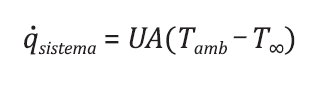 (5)Onde 𝑈 é o coeficiente global de transferência de calor, A a área superficial do resfriador, 𝑇𝑎𝑚𝑏 a temperatura ambiente e 𝑇∞ a temperatura da água residente no chiller. Em situações de transferência de calor conforme desenho esquemático na Figura 6, o conceito de coeficiente global de transferência de calor (U) é apresentado como uma maneira de sistematizar as diferentes resistências térmicas equivalentes existentes em um processo de troca de calor entre diferentes correntes de fluido e superfícies divisoras. Considerando que este sistema (resfriador e meio) se encontrem em regime permanente, com propriedades constantes, e sistema unidimensional, o coeficiente global de transferência de calor pode ser obtido pela seguinte equação: