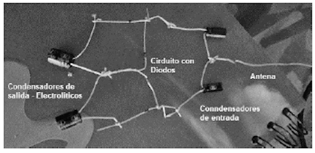 Figure 3, shows the developed circuit where electronic devices are used, 2 input capacitors to store energy, a circuit of 4 current rectifier diodes, and 2 electrolytic capacitors to store the output energy. Capacitors can vary in value, their value can be about 100 microfarads running at 16 volts, diodes must be of the following nomenclatura 1N34, OA70, 1N4148 low voltage drop.