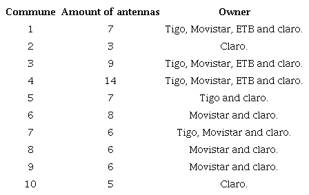 The result of this project was a low-cost prototype that allows us to capture the free energy found in the environment and transform it into useful energy to power other electronic devices. Figure 1 shows the architecture of the device used for energy harvesting, takes advantage of the electromagnetic signals that are captured by an antenna which takes the energy to the electronic prototype where the conversion of rf signals to direct current pulsating CD that is stored in capacitors is carried out to later be used. Table 1 shows that there are 71 antennas located in the different communes of a city in Colombia. Figure 2 shows the electrical circuit of capacitors and diodes that constitute the main elements of the device used for the capture of the energy “energy harvest” that transport the electromagnetic waves of RF that are captured by an antenna, the function of the first condenses.