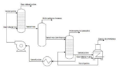 El varsol pobre es bombeado a la torre de absorción, allí, la corriente es utilizada como medio absorbente para retener los hidrocarburos (propanos, butanos, pentanos y pesados) que se encuentran en una corriente de gas natural rico que se alimenta en contracorriente. Luego, el varsol enriquecido con estos hidrocarburos pasa a una etapa de separación que se lleva a cabo en una torre desetanizadora en la cual se despojan los más livianos (metano y etano); después, este fluido es enviado a una torre de fraccionamiento en la que se recuperan los hidrocarburos más pesados; posteriormente, la corriente sale por el fondo de la torre y se separa en dos corrientes nuevas, una de ellas es enviada a los hornos de llama directa para ser calentada y alimentada a la torre de fraccionamiento, y la otra es utilizada como aceite térmico en los rehervidores de las demás unidades de proceso para ser posteriormente bombeada a la torre de absorción e iniciar el proceso nuevamente (Figura 1).