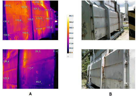 En ausencia de fallas en el aislamiento térmico, las termografías presentarían mínimas variaciones en la escala de temperaturas de las paredes de los equipos, es decir, una coloración semejante en toda la superficie. No obstante, el aislamiento térmico al interior de los hornos se ha deteriorado con el tiempo, lo que se evidenció por zonas en las que hay un cambio abrupto de coloración (temperaturas) como se observó en las imágenes termográficas (puntos calientes) (Figura 2). Adicionalmente, en las caras externas se constata que hay zonas que han sido afectadas por el óxido [2].