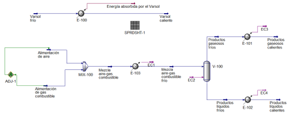 Para cada uno de estos, se utilizó una distribución diferente de equipos puesto a que la reacción de combustión involucra dos calores sensibles y un calor latente, mientras el cambio de temperatura de la corriente de varsol involucra únicamente un calor sensible.