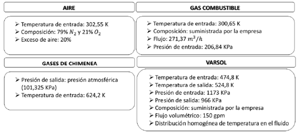 La compañía suministró información con respecto a la composición del fluido de trabajo (varsol), composición y variables operacionales de transporte del gas combustible, comportamiento térmico de los hornos (termografías), parámetros de diseño de los equipos y datos operacionales monitoreados por el sistema SCADA. Posteriormente, se depuró la información compilada con el fin de capturar los datos más relevantes asociados directamente a la eficiencia operativa de los equipos en relación al consumo de gas combustible y con dicha información, se plantearon opciones que permitieran mejorar la eficiencia de los hornos, basados en tres posibles causas que la impactan.