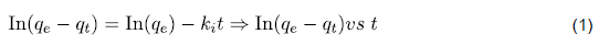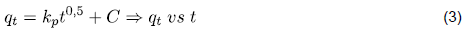 Onde, qt (g/g) é a quantidade de adsorvato adsorvido em um determinado instante de tempo t (min), qe (g/g) é a quantidade de adsorvato adsorvido no equilíbrio, k1 (cm ), k (g/g∙min), C (g/g) são constantes cinéticas, kp (g/g∙min0,5) é a taxa de difusão intrapartícula, α (g/g∙min) é a taxa inicial de adsorção e, β (g/g) é a constante de dessorção no equilíbrio.