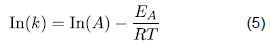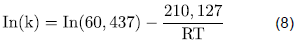 Onde, k representa a constante cinética do processo para uma determinada temperatura T (K), A é uma constante conhecida como fator de frequência ou constante de Arrhenius, R (J/mol∙K) é a constante universal dos gases e, Ea (J/mol) é a energia de ativação.