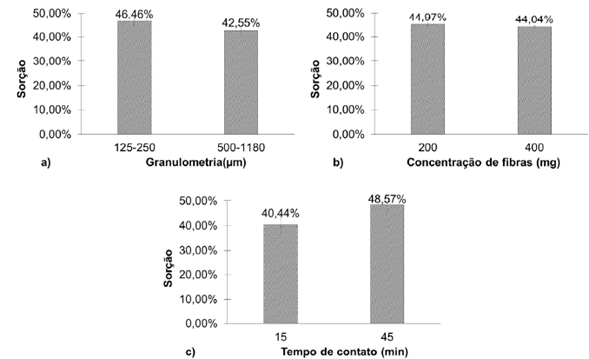 Na Figura 1 são mostrados os resultados das sorções médias para os ensaios realizados com as fibras às diferentes condições experimentais.
