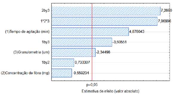 Na Figura 2, o gráfico de Pareto mostra a significância estatística das variáveis do modelo, para um intervalo de 95 % de confiança dos dados. A variável independente que mais influenciou o processo de adsorção do diesel nas fibras de coco foi o tempo de agitação da mistura. Já o efeito combinado do tempo de contato e granulometria das fibras influenciou de maneira negativa, reduzindo o poder adsortivo das fibras. A granulometria e concentração de fibras influenciaram individualmente de maneira negativa na adsorção, sendo a influência da quantidade fibras estatisticamente insignificante. O aumento de ambas variáveis de forma combinada levou a um aumento na sorção, com grande significância, evidenciando que a otimização da adsorção depende de todas as variáveis analisadas, do tempo e granulometria individualmente, e principalmente da granulometria e concentração combinadas.