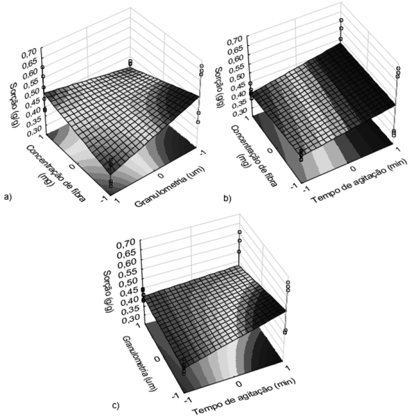 A Figura 3 mostra os gráficos de superfície de resposta que indicam as melhores orientações experimentais (indicadas na tendência dos tons mais escuros da escala de cinza) para a combinação ideal entre duas varáveis que levam à otimização de adsorção do óleo pelas fibras. Os resultados mostram que para as fibras maiores o aumento da concentração melhorou a capacidade de sorção, assim, essa poderia ser uma via a ser analisada para se otimizar a adsorção de óleo diesel em fibras de mesocarpo de coco. Porém, o melhor resultado foi obtido para 200 mg de fibras com granulometria de 125-250 µm. O decréscimo da quantidade de óleo adsorvido com aumento da granulometria é explicado pela redução na área de contato, sendo a adsorção um fenômeno de superfície, maiores áreas superficiais representam uma maior quantidade de sítios de adsorção [27].