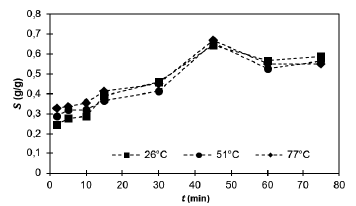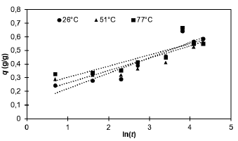 A quantidade adsorvida no pico, aos 45 min, cresceu com o aumento da temperatura, que causou a redução na viscosidade do meio líquido provocando um aumento na velocidade de difusão do adsorvato. Por outro lado, a sorção no equilíbrio diminuiu uma vez que elevação da temperatura provoca o deslocamento do equilíbrio adsorção/dessorção no sentido da dessorção diminuindo a quantidade máxima adsorvida [30].