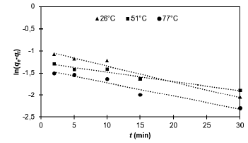 De acordo com Oliveira LMTM et al.[17], a cinética da adsorção de diesel em fibras de algodão é melhor representada modelo de pseudo-segunda ordem, pois o modelo era capaz de reproduzir bem a adsorção rápida no algodão onde o equilíbrio foi alcançado em 30 min, embora não represente fielmente os instantes iniciais do processo. O ajuste dos dados ao modelo cinético de pseudo-primeira ordem pode ser observado na Figura 5. No modelo de pseudo-segunda ordem, qe é uma constante encontrada a partir do ajuste linear dos dados, já para implementação do modelo de pseudo-primeira necessita-se o conhecimento prévio do valor de qe no equilíbrio. Neste estudo esse valor foi estabelecido como sendo o do último ponto analisado aos 75 min, conforme proposto por Oliveira LMTM et al.[17] em seus estudos.