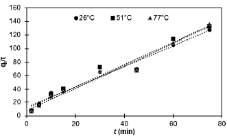O ajuste dos dados ao modelo de pseudo- segunda ordem é exibido na Figura 6. Para as três temperaturas o modelo apresentou ajustes melhores que os obtidos no modelo de primeira ordem, além disso, o de segunda ordem pode ser aplicado a todos os dados obtidos, inclusive aos valores de pico. Diferente do modelo de primeira ordem, os valores de qe do modelo de pseudo-segunda ordem condizem com os valores observados experimentalmente. Ao avaliar a adsorção de Diesel-S50 em crisotila, carvão ativado e fibras de carbono, Oliveira LH [29] observou que para os três casos o modelo de pseudo-segunda ordem era o que melhor representava a cinética da adsorção, segundo o autor a adsorção de componentes do petróleo tem se ajustado melhor a esse modelo.