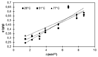 Os valores do ajuste na Figura 7 mostram que a difusão não é o fator determinante na adsorção do diesel em fibras de coco para todas as temperaturas trabalhadas. Estudo realizado por Roumie JPR et al.[37] mostrou através das micrografias realizadas no biossorvente in natura, que as fibras de coco são materiais macroporosos que apresentam baixa resistência à difusão [38,39]. O modelo por sua vez, não leva em conta a geometria e a porosidade dos materiais adsorventes [22], o que pode ter causado um grande desvio entre a quantidade adsorvida observada e aquela predita pelo modelo. O fato dos dados não se ajustarem ao modelo de difusão intraparticular não significa que esse fenômeno não ocorra. No entanto pelo fato da fibra se apresentar como um material macroporoso, a resistência a difusão não limita a adsorção, isto é, não interfere na velocidade [40].