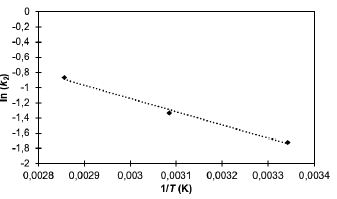 A Figura 9 mostra a representação da constante de cinética do modelo de pseudo-segunda ordem nas três temperaturas de estudo. Portanto, por meio da regressão linear (R2 = 0,9919) foi possível encontrar os valores da equação de Arrhenius, os quais se encontram descritos na Equação 8.
