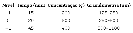 500 µm e 500-1180 µm. Para os estudos foi utilizado o DIESEL SHEL EVOLUX B S10, marca Shell, obtido em posto da cidade de São Luís - MA. Para determinar as condições de adsorção que possibilitem o melhor valor de qe foi realizado um planejamento fatorial completo 23, com um ponto central (Tabela 1).