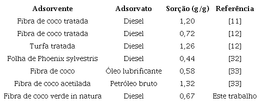 Um adsorvente para remediação de derramamento de óleos é Peatsorb®, importado e feito a partir de fibras de Turfa, uma espécie de alga encontrada no Canadá. Estas fibras após tratadas possuem potencial de adsorção de 1,26 g/g [12]. Pelo fato de a fibra de coco ser localmente abundante, economicamente viável e ter capacidade de adsorção sem tratamento químico, ela se apresenta como uma boa opção de adsorvente para resíduos de óleo diesel, seja ela aplicada diretamente no diesel puro, em filmes superficiais sobre a água ou na adsorção de resíduos oleosos. Até o presente momento, poucos estudos tem sido realizados na aplicação de fibras naturais como adsorvente de óleos puros, a Tabela 2 traz as capacidades de adsorção observadas em alguns dos poucos trabalhos realizados.