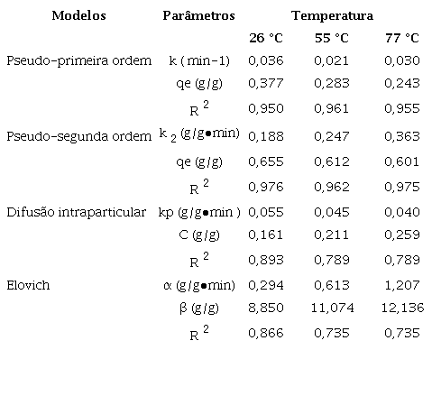 Uma vez determinadas a concentração e granulometrias ótimas, para obtenção da constante cinética de adsorção foram realizados ensaios com tempo de contato de 2, 5, 10, 15, 30, 45, 60 e 75 min. Os dados obtidos foram ajustados aos modelos de pseudo-primeira ordem, pseudo- segunda ordem, difusão e Elovich.