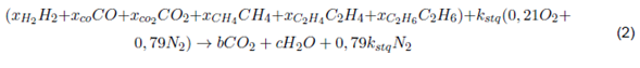 Donde xi representa la fracción molar de la especie i en el gas de síntesis, y kstq es el coeficiente estequiométrico de la reacción. En seguida, se procede a realizar el balance atómico para cada uno de los elementos presentes en la reacción anterior. Con estos balances es posible determinar el coeficiente estequiométrico de la reacción.