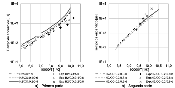 Finalmente, el mecanismo de Westbrook, respecto al cual se comparan los demás mecanismos, es el único mecanismo detallado considerado. Este fue desarrollado para estudiar la combustión de grandes hidrocarburos (n-octano hasta n-hexadecano) [21, 22]. El mecanismo de Westbrook cuenta con 5030 reacciones y 1282 especies, conteniendo todas las reacciones y especies que tiene cada uno de los mecanismos semidetallados a evaluar [22]. De esta forma, el mecanismo de Westbrook, aunque acarrea un mayor costo computacional, constituye un modelo más preciso para simular procesos de combustión, respecto a los demás modelos cinéticos considerados. En la Figura 1 se presenta la validación del mecanismo de Westbrook. En esta figura se comparan los resultados obtenidos con este modelo, concernientes al retraso de encendido para diferentes mezclas de H2 y CO, contra datos experimentales reportados en [30]. Lo anterior permite deducir que es viable usar como referencia el mecanismo de Westbrook para la evaluación y selección de mecanismos de reacción semidetallados.