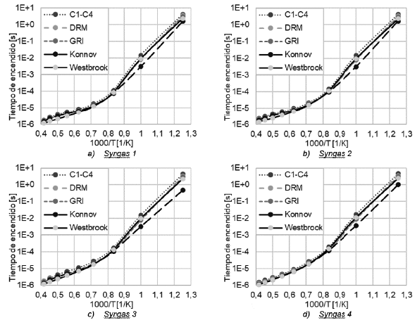 La Figura 2 muestra, a modo de ejemplo, los tiempos de encendido encontrados con cada uno de los modelos cinéticos evaluados, a una presión de 5 atm con Φ=1 y para todas las composiciones del gas y temperaturas iniciales consideradas. Cabe resaltar que, para todas las configuraciones simuladas, el tiempo de encendido presenta un comportamiento análogo al reportado en la Figura 2, además, en los resultados de este tipo no se evidencia claramente la diferencia entre los mecanismos de reacción. Por estas razones no se considera necesario reportar el tiempo de encendido para todas las pruebas realizadas. La Figura 2 permite tener una percepción clara de las magnitudes involucradas en la variable escogida para la comparación, evaluación y selección de los modelos cinéticos considerados.