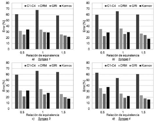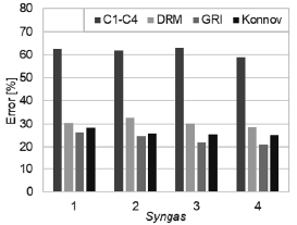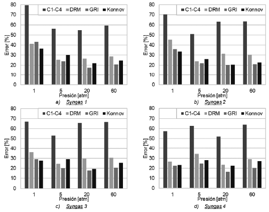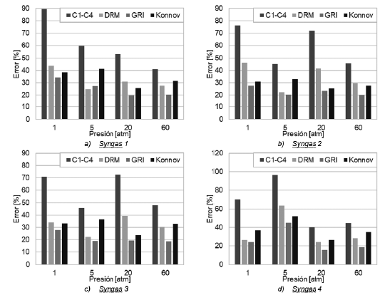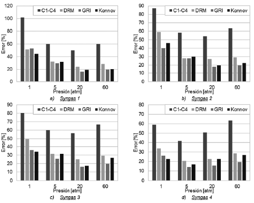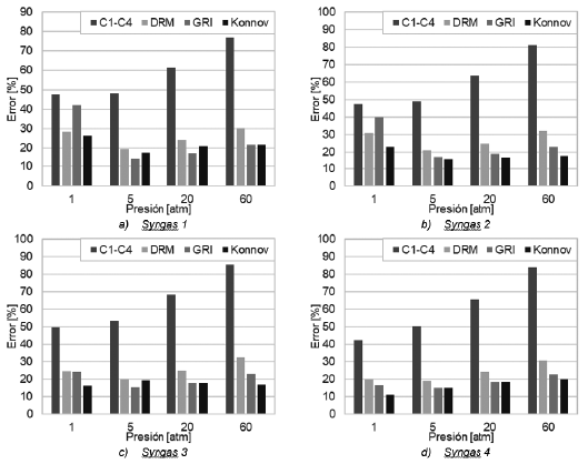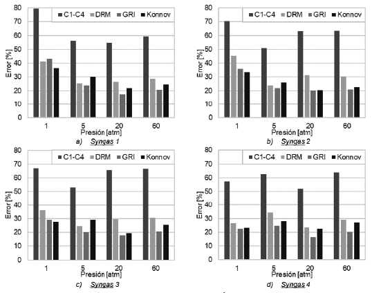 Como se observa el mecanismo DRM22 realiza sus mejores predicciones para el syngas 4 y las peores para el syngas 2, mientras que para el syngas 1 y el syngas 3 muestra errores similares, siendo un poco menores para el syngas 3. Esto evidencia que la confiabilidad de los resultados obtenidos con este mecanismo se ve afectada negativamente si en la composición del gas se eleva la concentración de CO, CH4 y C2H6. El mecanismo DRM22 tiene un error promedio global del 30,25 %.