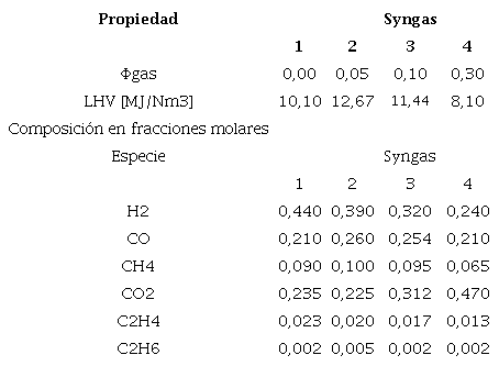 En la referencia [24], se muestra un estudio experimental basado en la producción de gas rico en hidrógeno a partir de la gasificación de aserrín de pino, utilizando un gasificador de corriente ascendente combinado con un reformador de cerámica porosa, el cual se encarga de enriquecer con hidrógeno el gas [24]. En la Tabla 1 se ilustran la composición del gas en fracciones molares y su poder calorífico inferior (LHV), en función de la relación de equivalencia implementada en la gasificación (Φgas) [24].