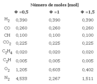 Por otro lado, a partir de la relación de equivalencia y kstq es posible calcular el coeficiente real de la reacción [13]. Finalmente, a partir de este último coeficiente y las composiciones del gas combustible y el aire, es posible determinar la composición de la mezcla de reactantes para cada uno de los casos evaluados [13]. A modo de ejemplo, en la Tabla 2 se presenta el número de moles de cada uno de los reactantes para las relaciones de equivalencia de interés y para la composición 2 del gas de síntesis.