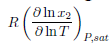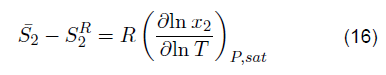 La ecuación 16 considera las diferencias entrópicas , el cociente de la primera derivada de las fracciones molares, entre la variación de la temperatura, siendo multiplicada por la constante de los gases a presión de saturación constante